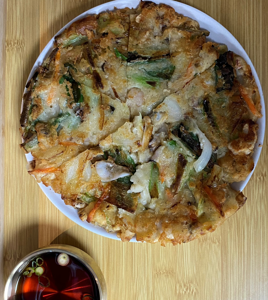 Korean style Pancake, pan fried with green Onion, Chives and mixed Seafood.